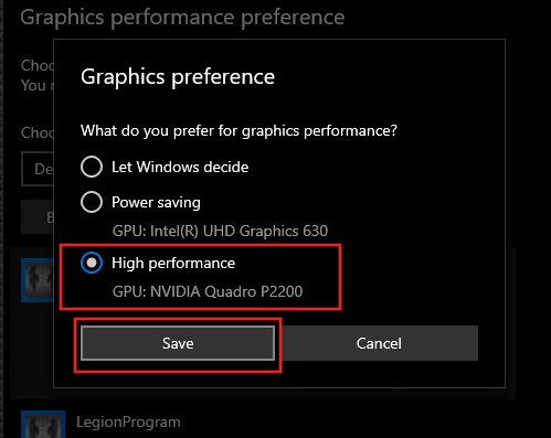 - High performance – Selects the discrete GPU, which provides better performance but consumes more power.