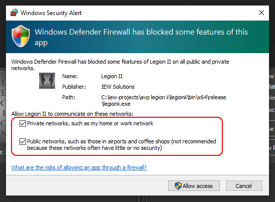 Since Legion relies heavily on the use of UDP packets to communicate with its many different components, and because this may be the first time the app has been launched, Windows will need to ask you for permission to allow it through the firewall.