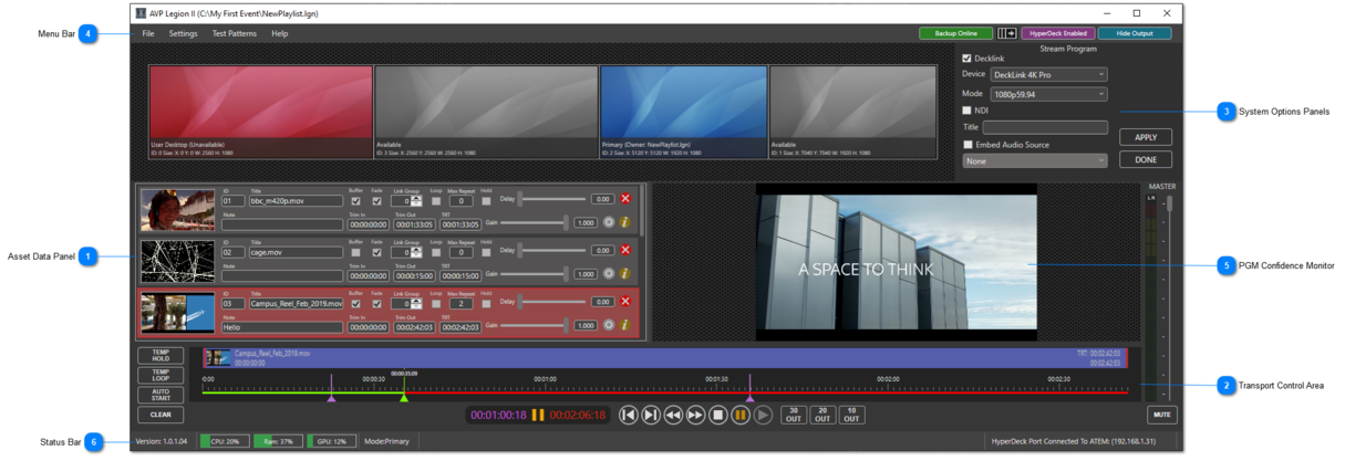 TIP: You can grab the slim vertical bar between the asset data panel and the confidence monitor with your mouse and drag it to resize those sections. These adjustments along with the overall size of the window are saved and will be recalled each time the app is started.