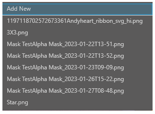 Add New opens a file browser. When one is selected it will first be copied into the Masks sub folder, (Folder is automatically created and placed under the event show folder.) then the image will be placed onto the design canvas.