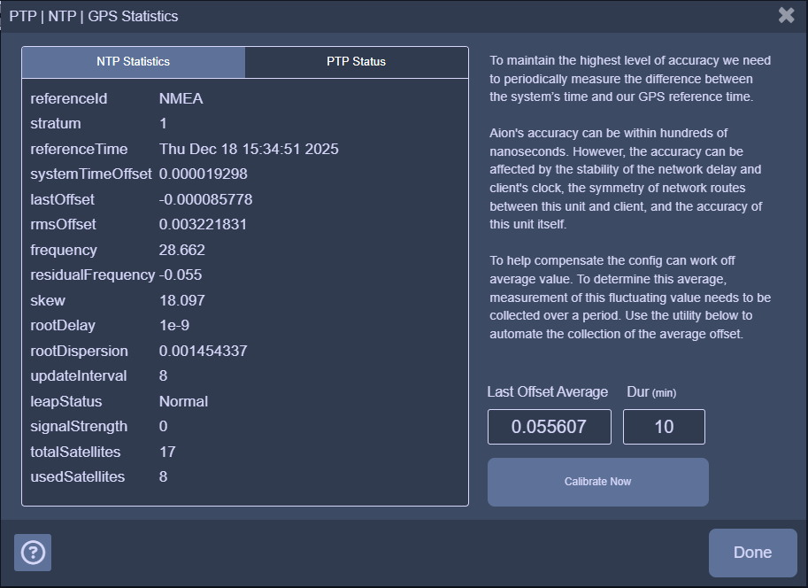 PTP STATUS DISPLAY: ✓ PTP available (service running and broadcasting) ✓ Role (should be Master) ✓ Timer source (System = GPS-disciplined clock, correct) ✓ Auto-sync active (continuous GPS recalibration) ✓ Last auto-sync (timestamp of most recent calibration)