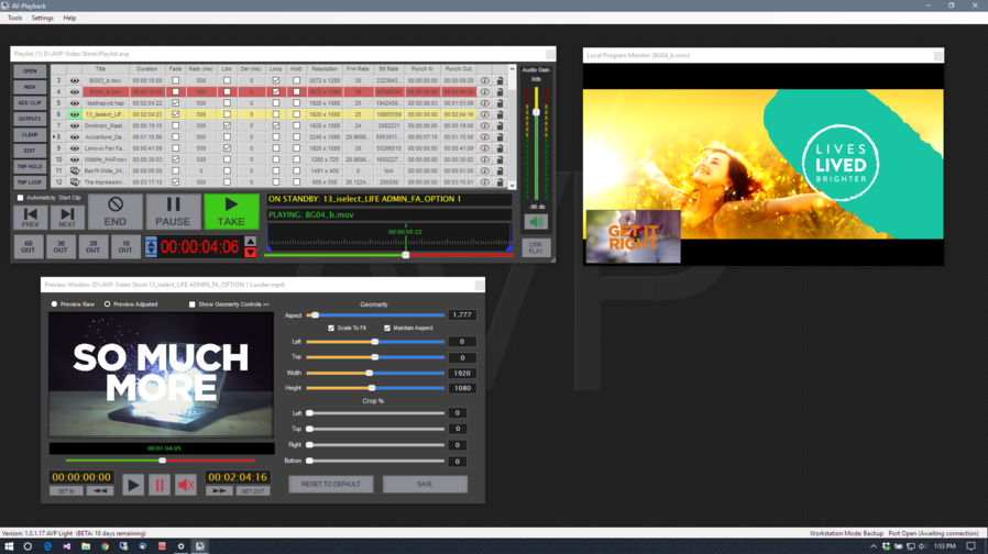 It is also capable of synchronized control of another copy of AV-Playback running on a separate backup workstation. The backup will follow in lock step with events occurring within the master workstation. This includes opening of playlists, if the playlist does not exist on the backup it will transfer the data and automatically create a matching one. Also, any video clips that are not already on the backup node but are needed in the playlist, AV-Playback will automatic transfer will be initiated for each of the missing clips, saving you from having to move them manually.